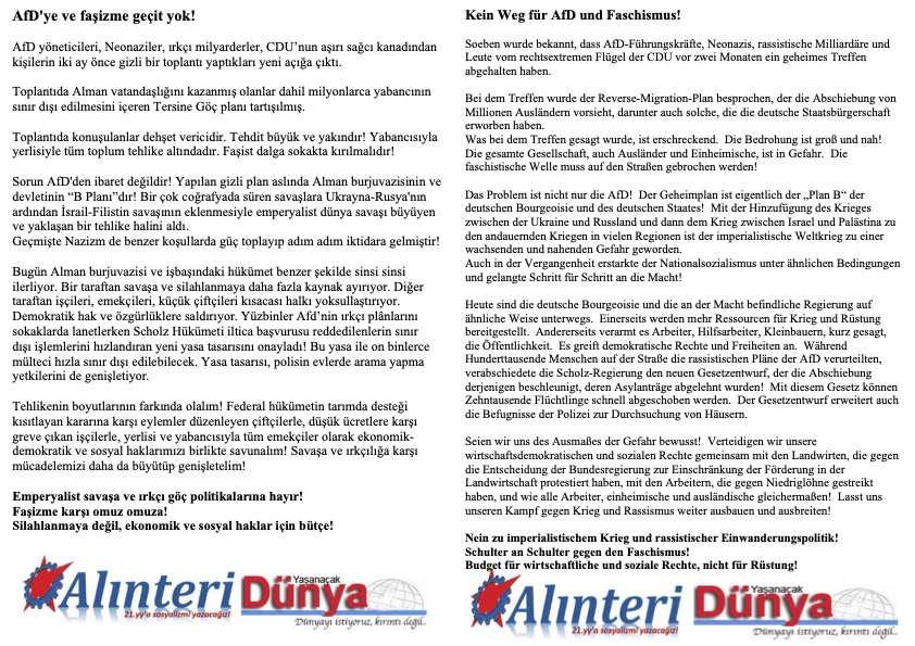 Almanya’da faşist grupların “tersine göç” ettirme planlarının açığa çıkmasının ardından yaşanan sürece dair Alınteri ve Yaşanacak Dünya ortak bir bildiri yayınladı