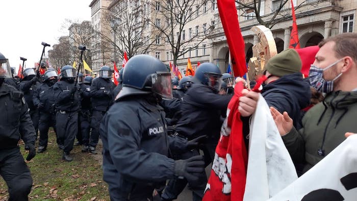 Neonazilerin eylem ve yürüyüşlerinde tanık olunduğu üzere “fiziki mesafe” “maske takımı” gibi önlemlerin alınmasını çok da önemsemeyen, faşistlere “toleranslı” davranan Alman polisi bu kez “Pandemi önlemlerine uyulmadığı“ ve “DDR gençliğinin yasaklı flamalarının taşındığı” gerekçelerini öne sürdü, devrimcilerden oluşan korteji hedefleyerek saldırdı. Provakasyon ve saldırıda çok sayıda eylemci yaralandı, gözaltıların olduğu bildirildi.