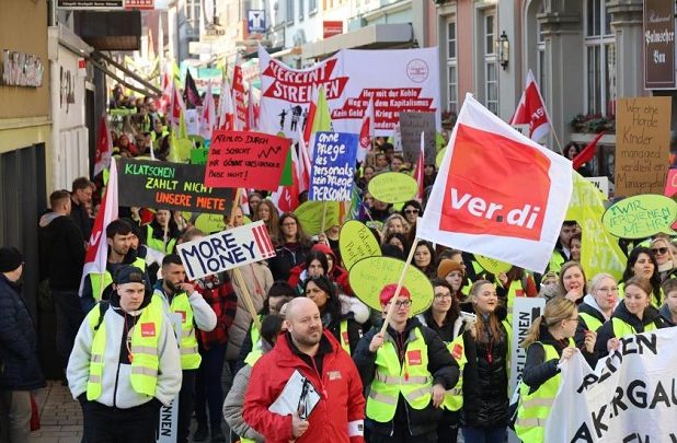 Federal ve yerel düzeyde 2,5 milyon kamu emekçisi, 160 bin postacı ve 180 bin demir yolu işçisinin ücret toplu sözleşme görüşmeleri devam ediyor. Haftalardır neredeyse her gün Almanya’nın bir eyaletinde binlerce emekçi uyarı grevine çıkarak ücretlerin yükselmesi için mücadele ediyor.