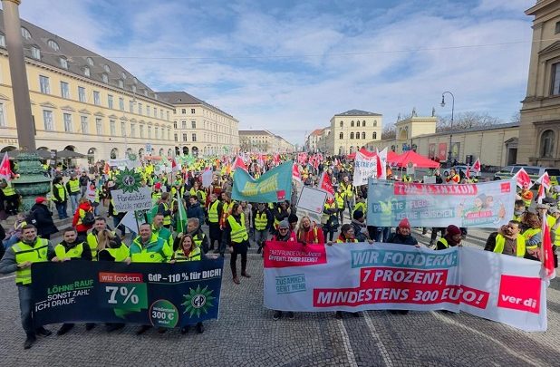 Almanya’da 2,2 milyon kamu çalışanını ilgilendiren toplu sözleşme görüşmelerinin ilk iki turunda anlaşma sağlanmaması üzerine Birleşik Hizmet Sendikası (ver.di) birçok eyalette uyarı grevleri gerçekleştirdi. Eyalet başkentlerinde düzenlenen gösteri ve yürüyüşlere binlerce emekçi katıldı.