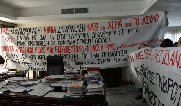 Bakanlık yetkilileri ile görüşme talep eden protestocular, polisin engellemelerine rağmen Eğitim Bakanı Kostas Gavroglou’nun ofisini bastı.