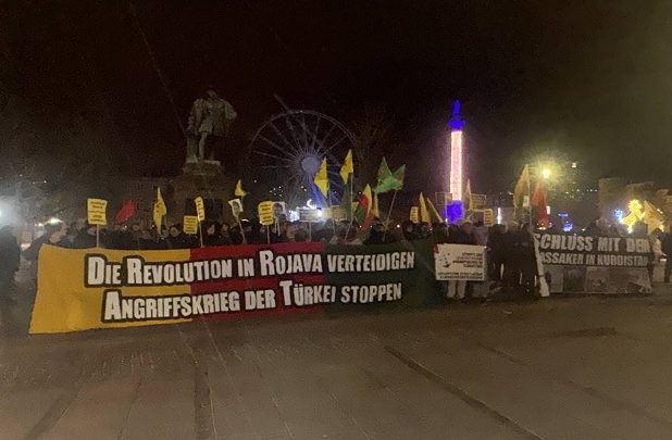 Faşist Türk devletinin Rojava’da gerçekleştirdiği katliamlara karşı Almanya’nın Stutgart kentinde de protesto eylemi gerçekleştirildi. Polisin yürüyüşe izin vermemesi üzerine basın açıklaması yapılarak eylem bitirilirken iki kişin polis tarafından gözaltına alındığı görüldü.