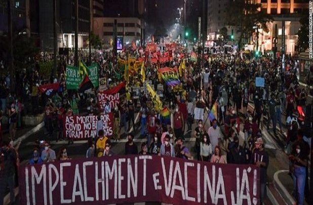 Başkent Brasilia ve Rio de Janeiro başta olmak üzere birçok kentte düzenlenen kitlesel eylemlerde “Kolumuza aşı, tabağımıza yemek, eğitime yatırım istiyoruz”, “Bolsonaro soykırımı” veya “Bolsovirüs defolun” yazılı döviz ve pankartlar taşındı, Bolsonaro’nun kuklaları yakıldı.