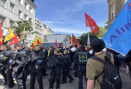 Oldukça uzun yürüyüş kortejinin bir aşamasında MLPD’nin propaganda arabasının yürümesine “Diğer göstericiler sizi istemiyor“ gibi bir uyduruk gerekçeyle izin verilmedi. Kortejdekilerin polisin tavrını protesto eden konuşmaları ve arabasız yürümeyi kabul etmeyerek beklemeleri, çevreden gelen ıslıklı protesto sesleri sonucu polis bu yasağı kaldırdı. Yürüyüş devam etti..