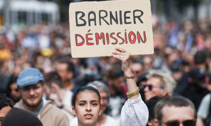 Seçimden sol ittifakın birinci çıkmasına rağmen merkez sağın adayı Michel Barnier’in başbakan olması sokaklarda protesto edildi.