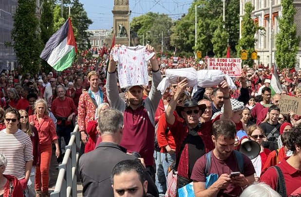 Hollanda’nın Lahey kentinde çeşitli örgütler, sendikalar, partiler “Kırmızı çizgi çek” adı altında Filistin’le dayanışma eylemi gerçekleştirdi.