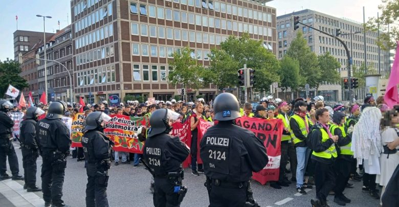 Kiel kentinde bir kaç gündür kamp kurmuş olan “Rheinmetall’i Silahsızlandırın İttifakı” silahlanmaya ve savaş endüstrisine karşı Cuma akşamı yürüyüş düzenledi, eylemi bloke etmek isteyen polise direndi. Polis gaz sıkarak eylemcilere saldırdı. Polis “iki memurun yaralandığını” açıklarken, eylemciler çok sayıda aktivistin yaralandığını bildirdi.