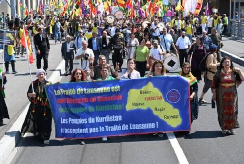 Lozan Antlaşması’nın 100’üncü yılında dörtparça Kürdistan kökenli Kürtler ve destekçi parti, örgüt ve kurumlar, İsviçre’nin Lozan kentine yürüyüş gerçekleştirdi. Lozan görüşmelerinin yapıldığı Beau-Rivage Place binasının önünden başlayan yürüyüşte, Kürdistan haritasının yer aldığı pankart açıldı. Alanda TİKB bayrağı da dalgalandı.