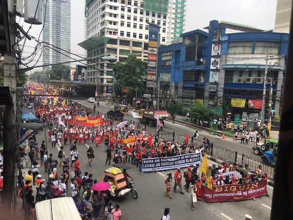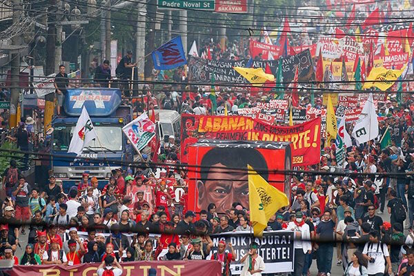 Filipinler Devlet Başkanı Duterte “halkın geçmişteki hükümet suistimallerine karşı öfkelerini ifade etme haklarını kullanmalarına izin vermek için 21 Eylül tarihini Ulusal Protesto Günü” ilan etmişti. Bu şekilde, saldırılarına ve katliamlarına karşı halkta birikmiş öfkeyi saptırmaya çalışan Duterte devlet dairelerini ve okulları tatil etti bugün. Ama bugün sokağa çıkan on binlerin öfkesinden Duterte de nasibini aldı. Ülkedeki faşist diktatörlüğü destekleyen Amerikan emperyalizmi de protesto edildi.