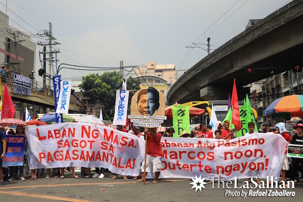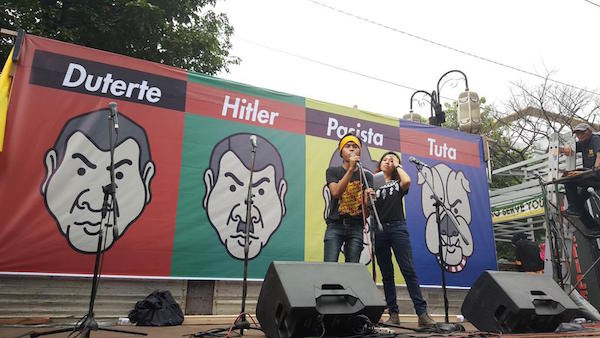 Onbinlerce protestocu, sıkıyönetim ilanının 45. yıl dönümünü “ulusal dayanışma günü” olarak ilan eden devlet başkanı Duterte’yi “Hitler gibi, Marcos gibi sen de faşistsin” diyerek sokakta yanıtladı.