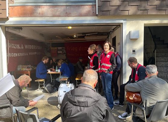 Etkinliğe Arbeitsbund für den Wiederaufbau der KPD’den (Almanya Komünist Partisi’nin yeniden inşası için işçi birliği) Yaşanacak Dünya’dan işçi olanlar kısa konuşmalar yaptılar. AGİF’ten Ford fabrikasında temizlik işçisi olarak çalışan arkadaşın gelememesinden kaynaklı işyerini anlattığı mesajı da okundu. İlk konuşmayı silah parçaları üreten bir fabrikada çırak olarak çalışan Johannes yaptı.