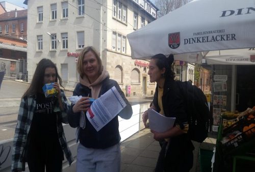 Bu kez Stuttgart Süd (Güney Yaka) bölgesinde yapılan bildiri dağıtımı sırasında, GEW sendikasından başka bir sendikaya geçmeyi düşünen ve memur olduğu için eylemlere katılması yasak olan bir meslek okulu öğretmeni ve savaş karşıtı genç bir askerle sohbetler de edildi.